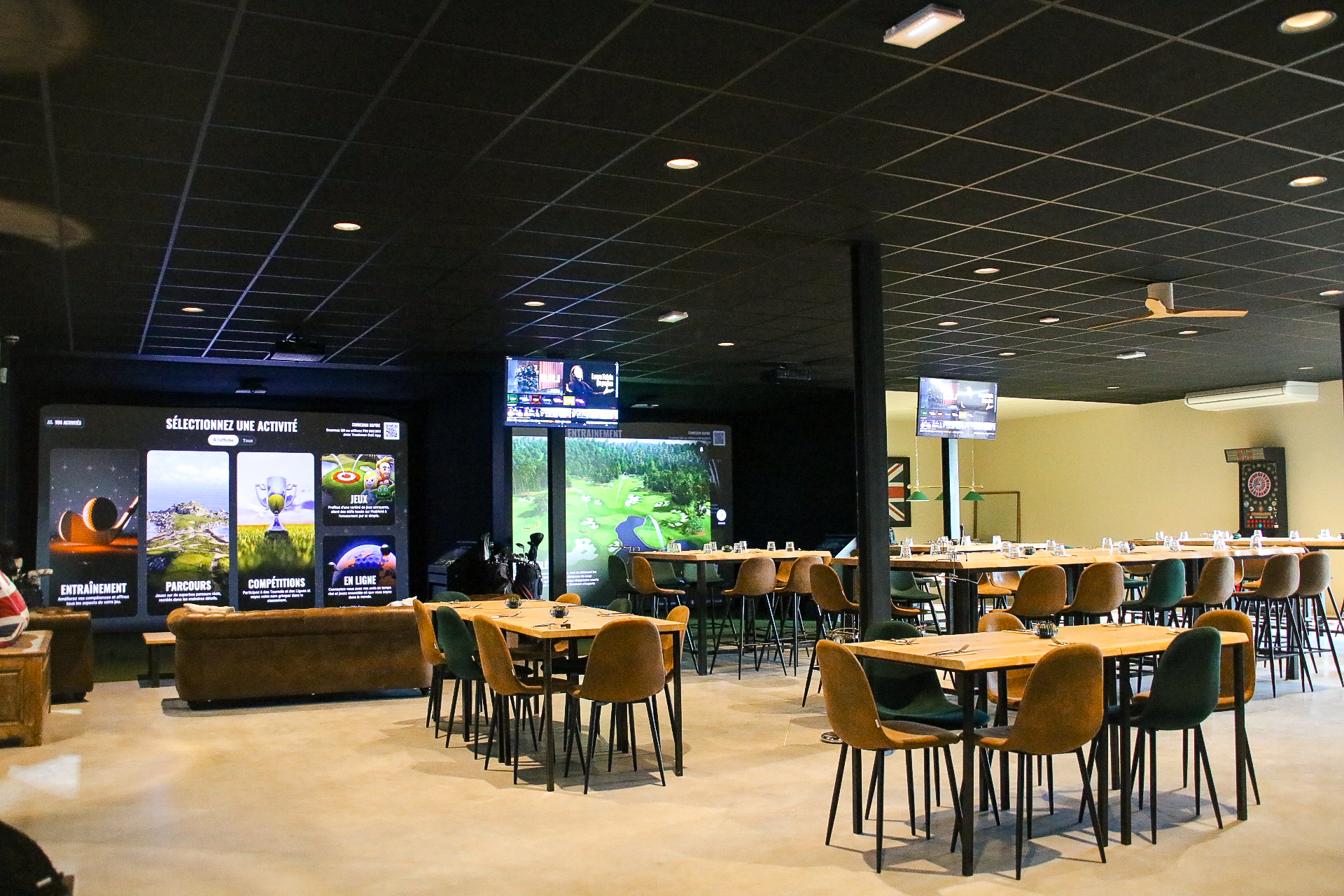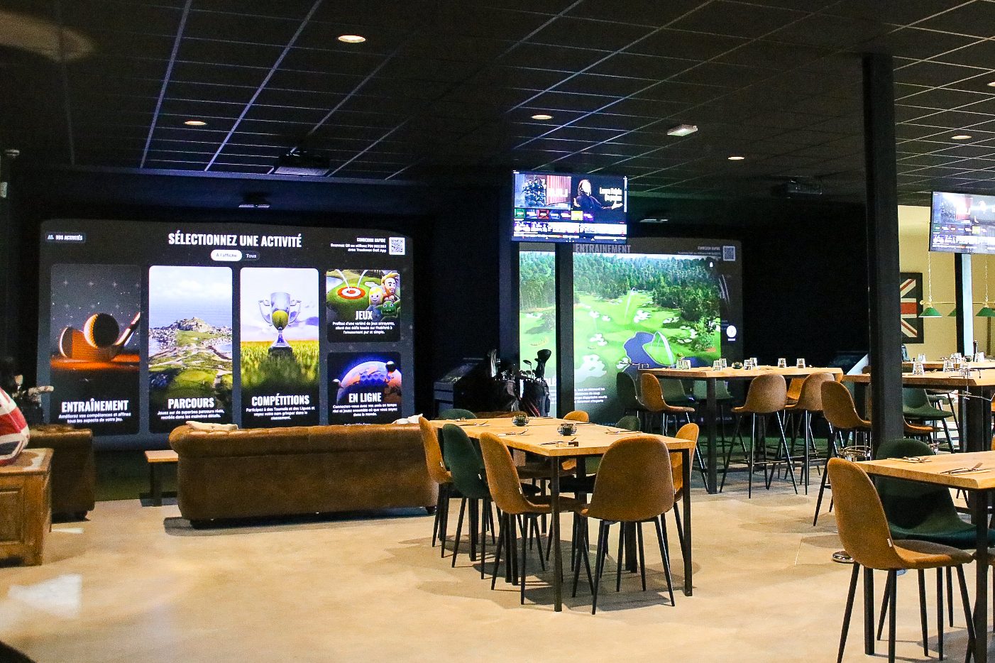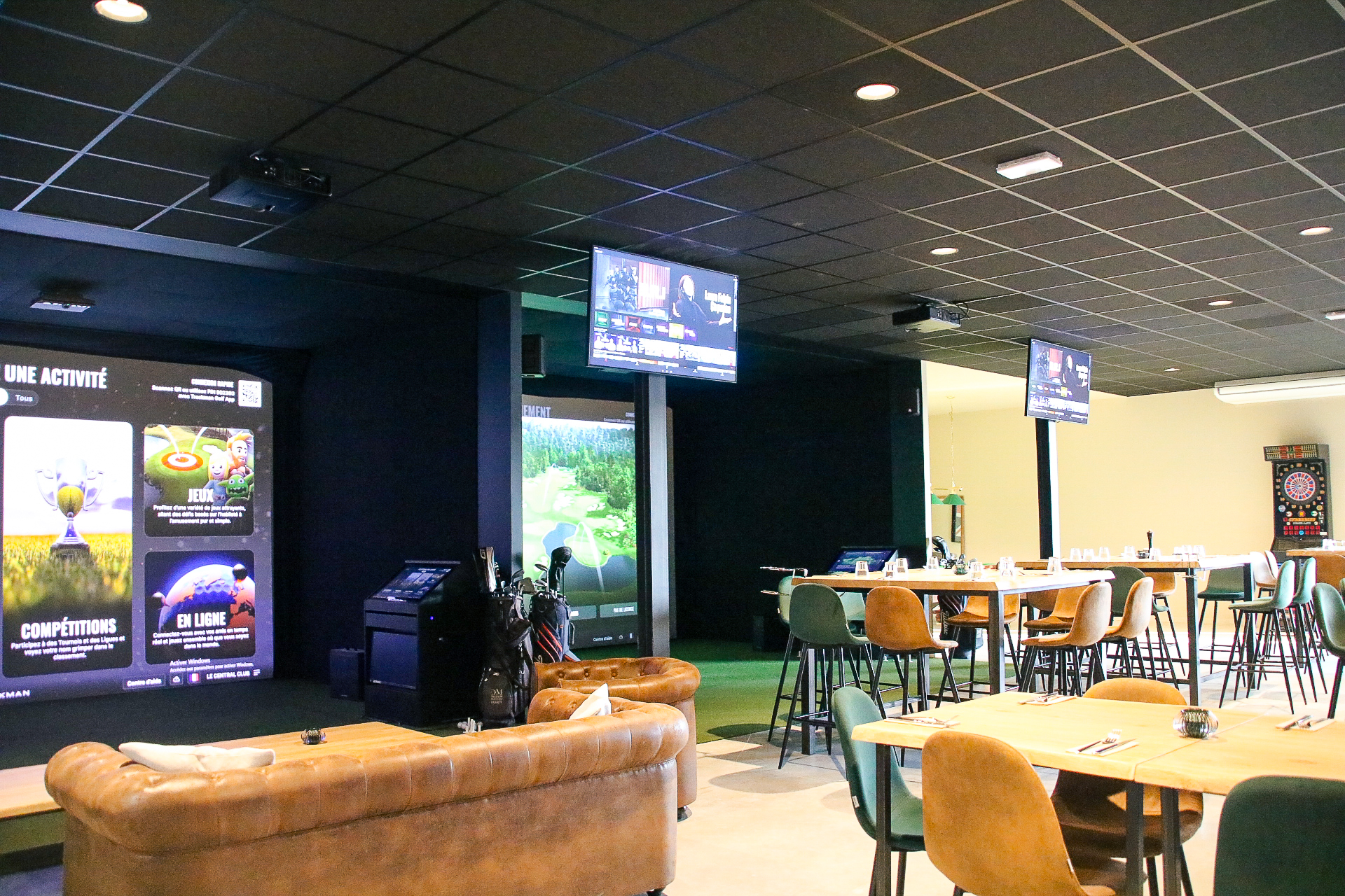 3 terrains de padel, 2 simulateurs de golf Trackman, espace billards et fléchettes.