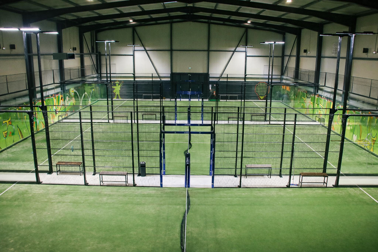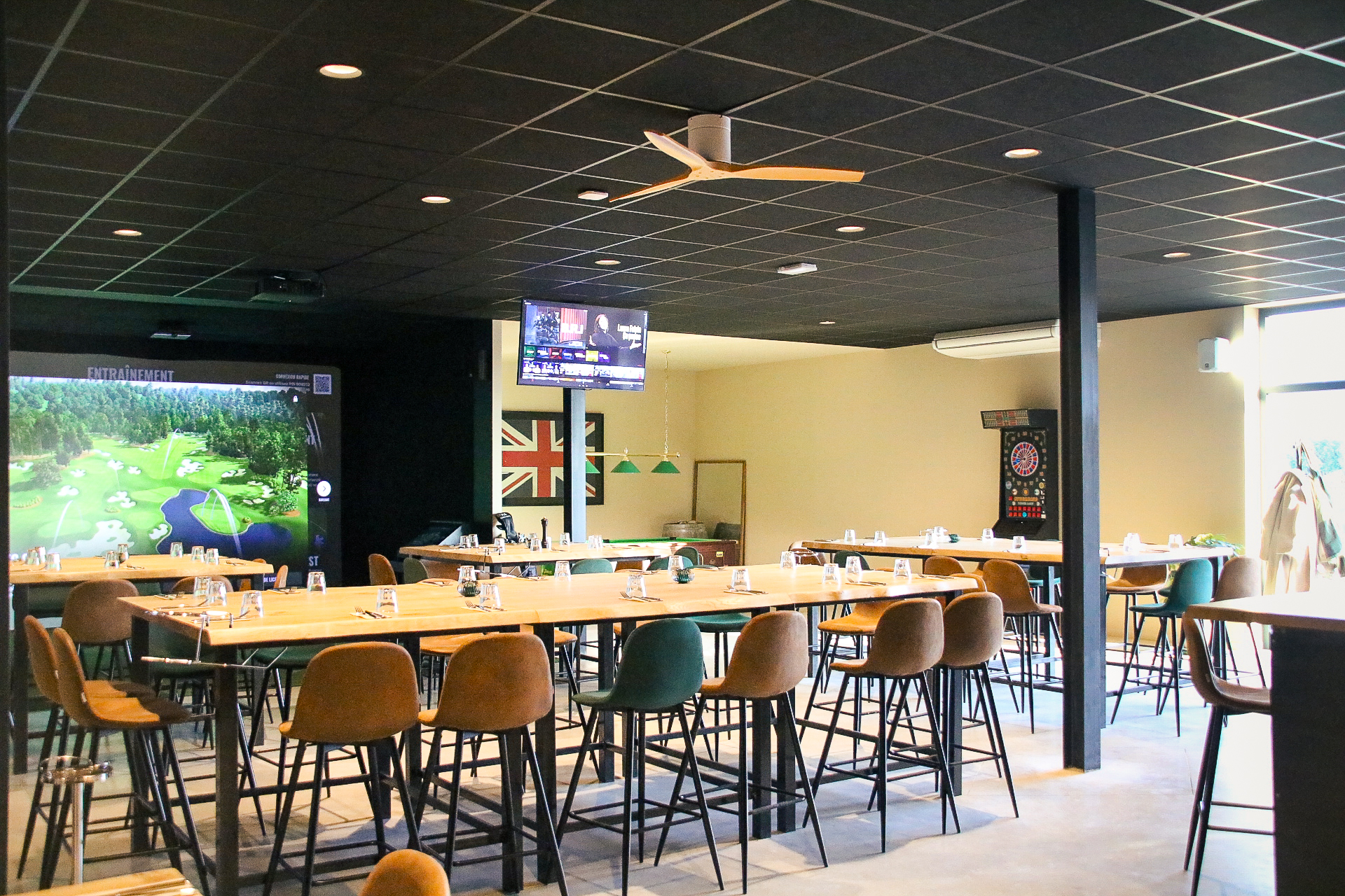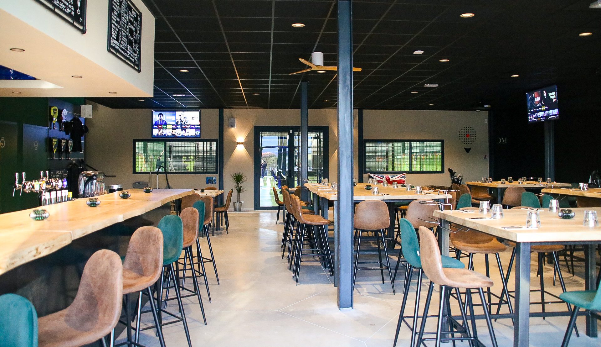 3 terrains de padel, 2 simulateurs de golf Trackman, espace billards et fléchettes.